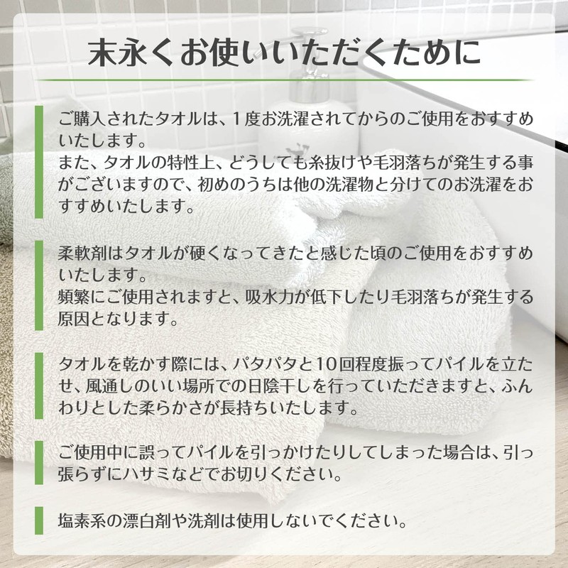 - [Warm Tips] Due to the characteristics of cotton products, there may be some fuzz. ■We recommend washing once before use. ■ Excessive use of fabric softener may lead to shedding and reduced absorbency, so we recommend using it when you feel the towel becomes hard. ■ Please refrain from using chlorine bleach or chlorine detergent as this may fade or discolor