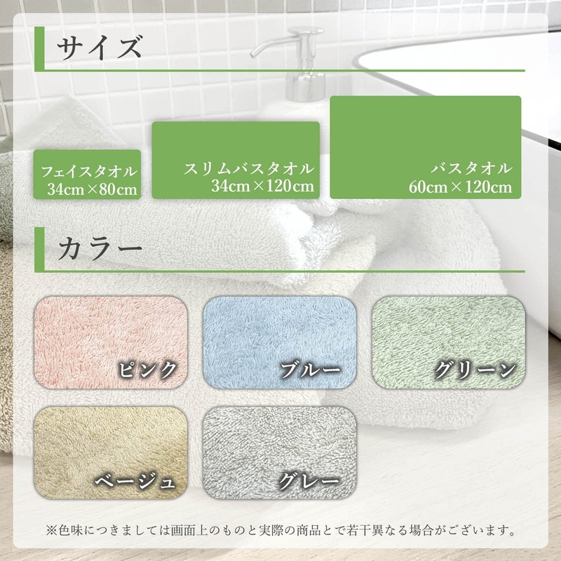- Product Size and Weight (per piece): Face Towel: Approx. 31.5 x 13.4 inches (80 x 34 cm), Approx. 3.5 oz (101 g), Slim Bath Towel: Approx. 47.2 x 23.6 inches (120 x 60 cm), Approx. 9.2 oz (260 g); Color: Pink, Green, Beige, Gray, Blue. Material: 10% cotton (Made in Super Zero)