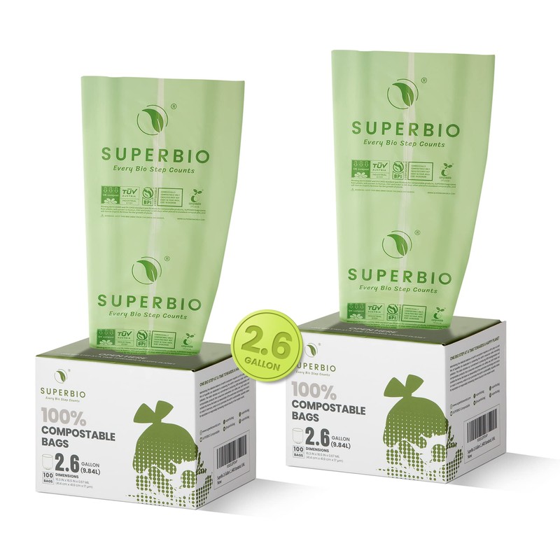 SUPERBIO 2.6 Gallon Compostable Flat Top Trash Bags, 100 Count, 2 Pack, Small Garbage Bags, Sturdy Food Scrap Bags Certified by BPI Meeting ASTM D6400 Standards