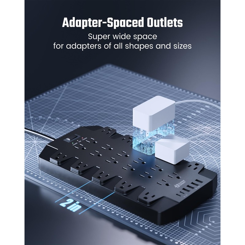 - 【2" Super Wide Outlets】Check our game-changing surge protector power strip with an impressive 2" extra-wide AC outlet spacing! SUPERDANNY outlet extender stands out with its wider socket spacing, perfect for accommodating bulky plugs and power adapters side by side, with none of them getting blocked. The four rows of outlets give you numerous ways of plugging in a variety of cords. No need for multiple power strips when one is enough!