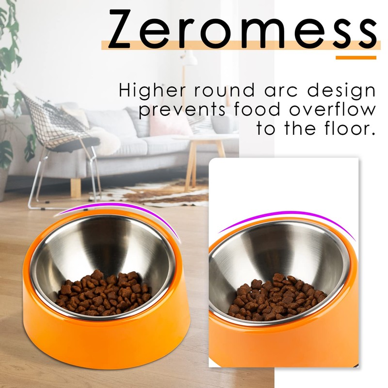 - Slanted Dog Bowl - Ergonomic 15 Degree Tilted Dog Bowl makes the food concentrate on the bottom and makes your pet easy to empty the food, as well as reduces risk of "bloat" and indigestion. Slightly elevated design helps pet's neck in alignment, protects their spine