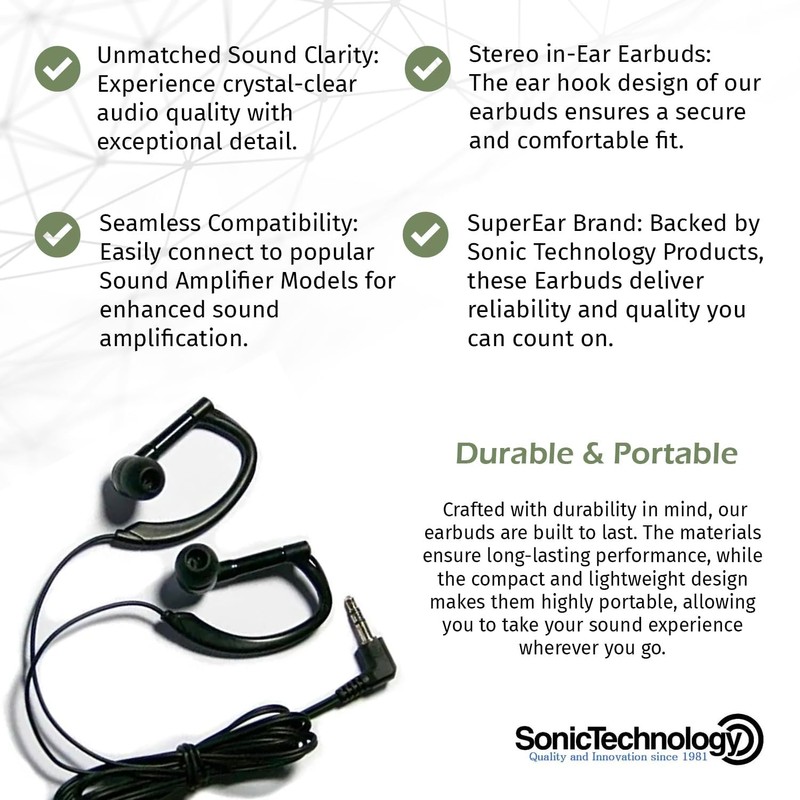 SuperEar Loud & Clear Stereo in-Ear Earbuds with 3.5mm Universal Connector: Earhook Style Ear Buds with Ear Loops Wired - Secure & Comfortable Fit, Fully Compatible with All Amplifiers