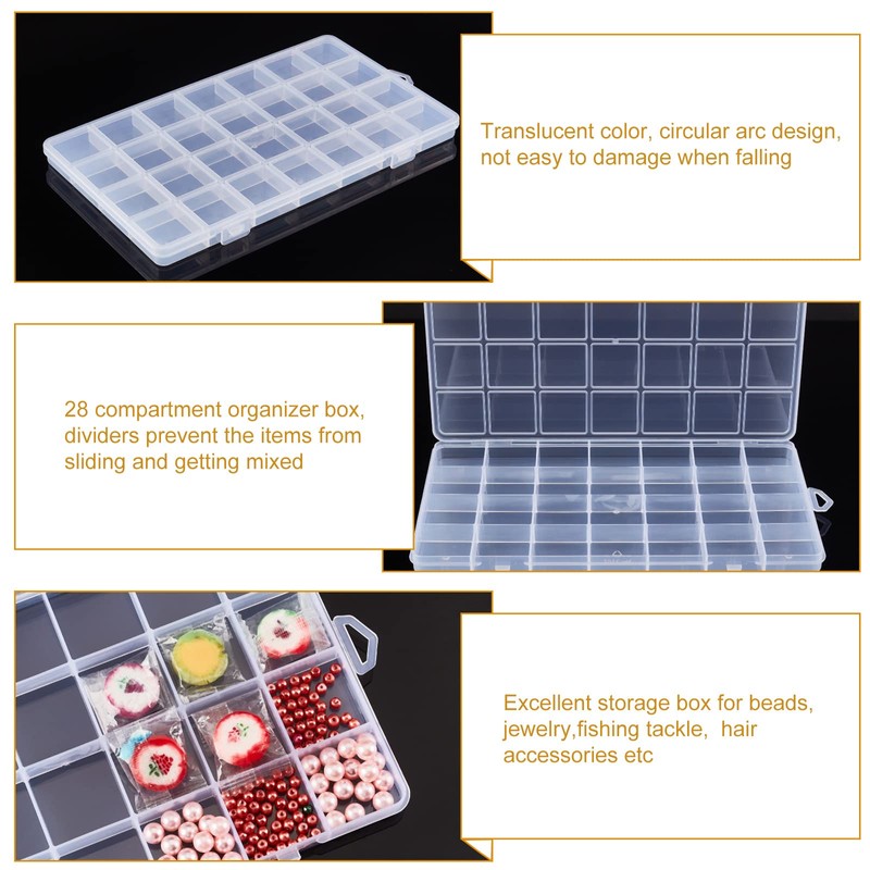 - Size and Quantity: You will get 4 bead storage boxes, each box has 28 compartments, each compartment measures 3x3cm, and the box measures 22.5x13.3x1.4cm.