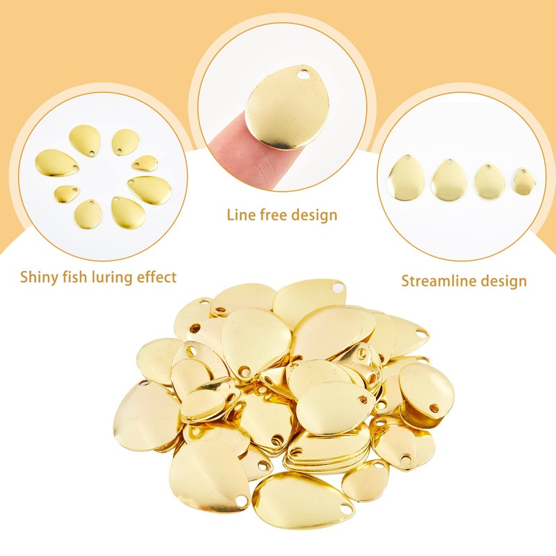 SUPERFINDINGS Over 56 Pieces Spinner Bait Spoon Rigs Golden Fishing Flattie Attractor Spinner Blades 4 Sizes Teardrop Spinner Spoons Tackle for Making Hard Bait