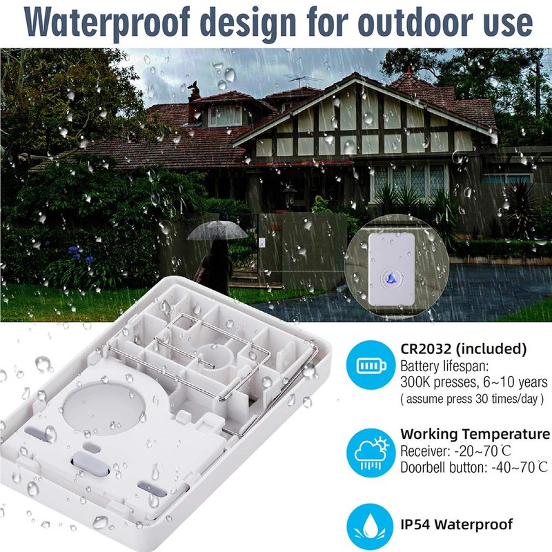 • IP 54 waterproof wireless push button works in temperature ranges from -22F to 158F, stands up to any weather so you can mount it anywhere outside without worrying. Come with one CR2032 battery, up to 10 years battery life (300,000 times of using), no need to replace battery almost.