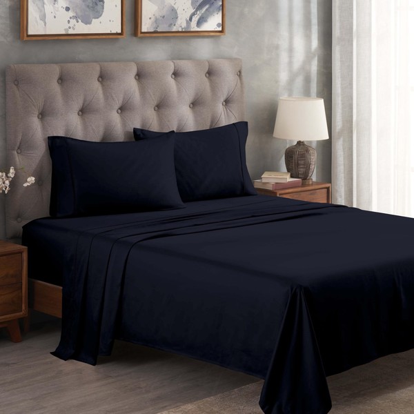 Superior Egyptian Cotton 300 Thread Count Bed Sheet Set, 1 Elastic Deep Pocket Fitted Sheet, 1 Flat Sheet, 2 Pillowcases, Daily Soft Sheets, Luxury, Plush, Home Essentials, Queen, Navy Blue