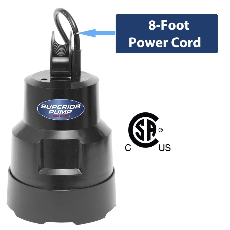 - Tough thermoplastic construction; Oil-free motor design; Convenient carrying handle; 8-foot power cord; CSA listed; Simple operation, plug pump in to turn on, unplug to turn off
