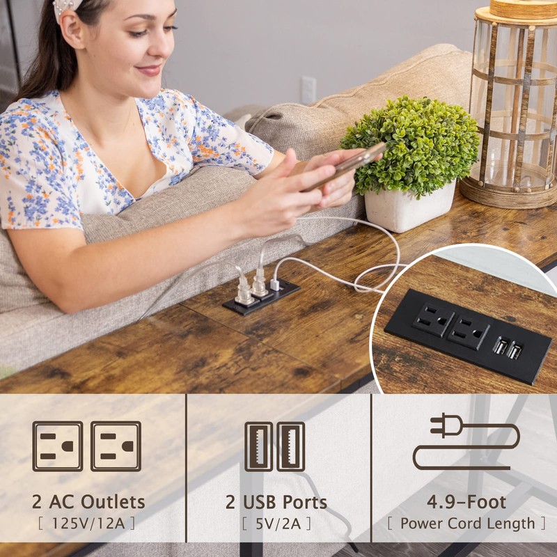 - [Charging Station Is Ready]: Look around to charge your phone? No! Here comes this SUPERJARE charging sofa table with 2 outlets and 2 USB ports. Lamps, Headset, iPad, small fan... All settled. No low battery worries