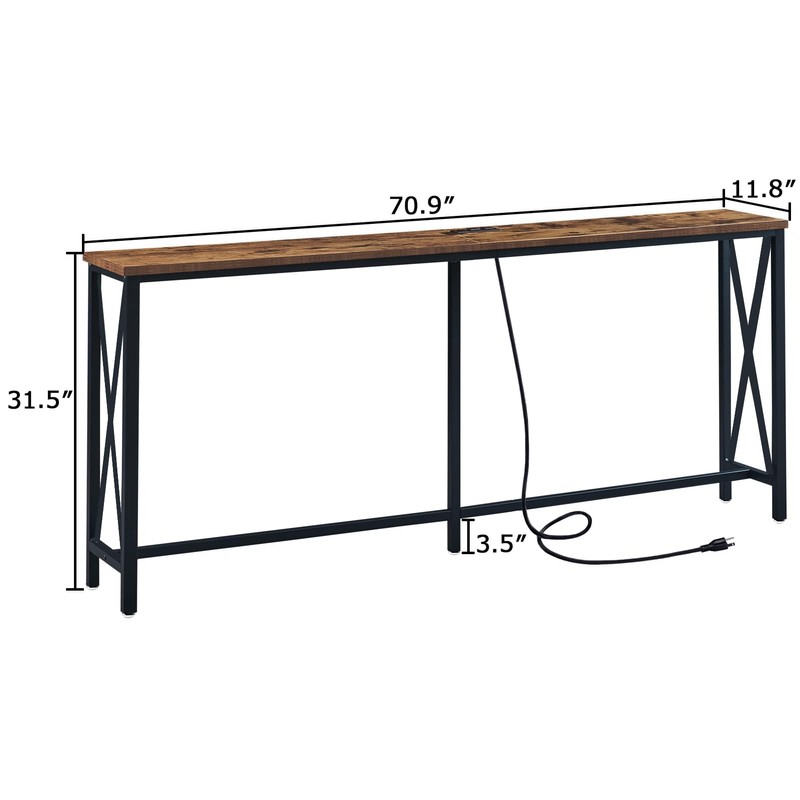 SUPERJARE 70 Inch Console Table with 2 Outlet and 2 USB Ports, Extra Long Entryway Table with Metal Frame and X-Shaped Design, Narrow Sofa Table for Living Room and Hallway - Rustic Brown