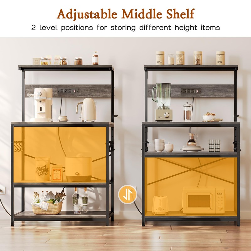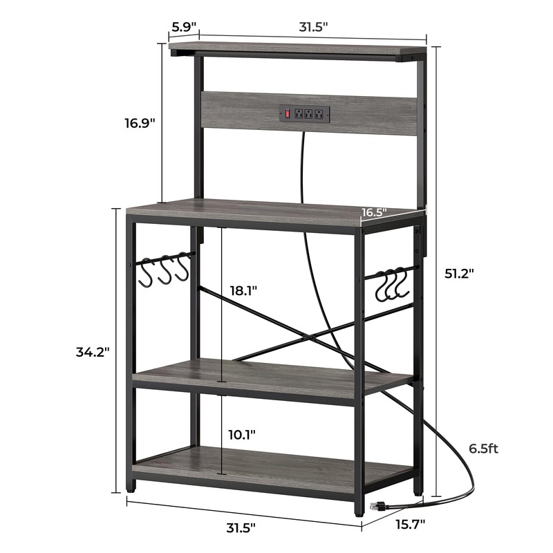 SUPERJARE Bakers Rack with Power Outlets, Microwave Stand, 31.5 X 16.5 Inch Larger Desktop, Kitchen Storage Rack with Adjustable Middle Shelf, 6 S-Shaped Hooks, Coffee Bar Stand, Grey