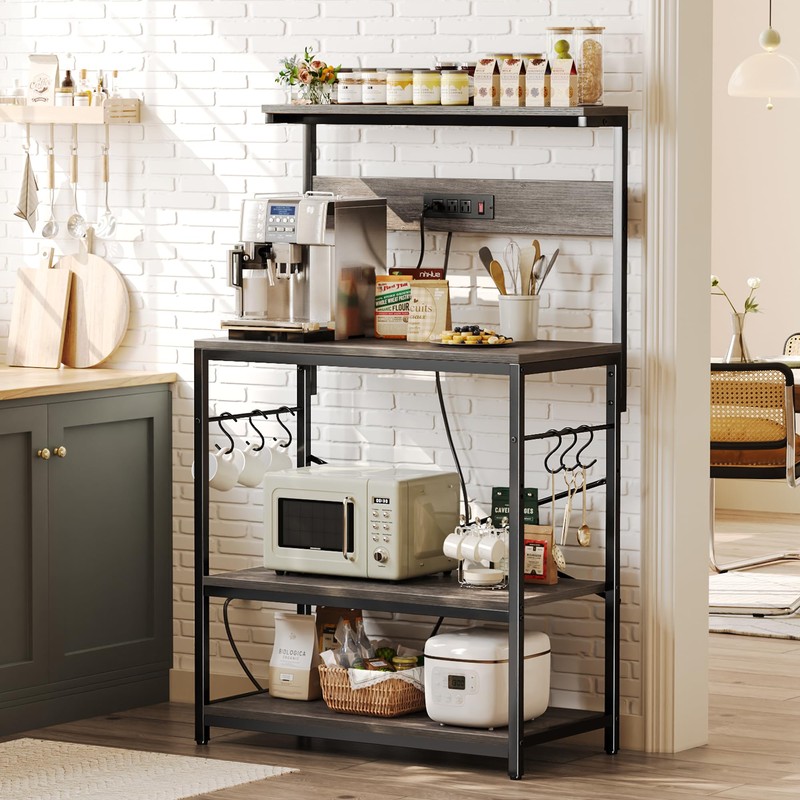 - 【Bakers Rack with Power Outlets】Imagine brewing your morning coffee with the coffee machine, blender, or kettle plugged right into the kitchen rack with 3 outlets and 1 safe switch. No more reaching behind heavy appliances and making every kitchen task easier and your counters clutter-free