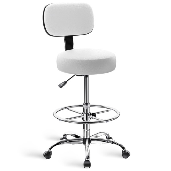 SUPERJARE Drafting Chair with Back, Adjustable Foot Rest Rolling Stool, Multi-Purpose Office Desk Chair, Thick Seat Cushion for Home Bar Kitchen Shop - White