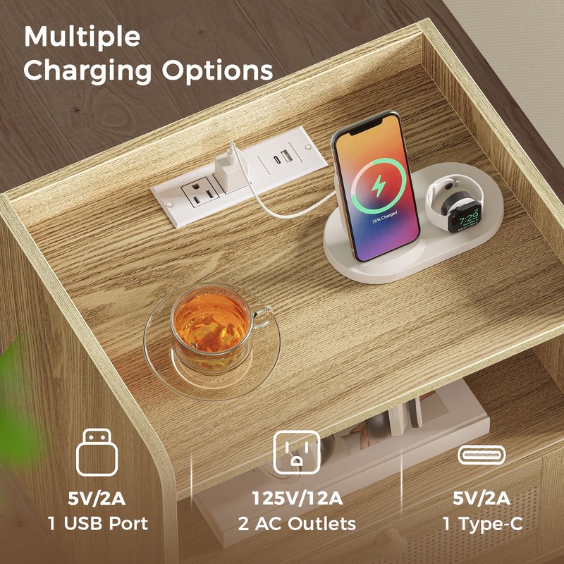 SUPERJARE Nightstands Set of 2, Night Stands with Charging Station & PE Rattan Decor Drawer, Bed Side Tables with Solid Wood Feet, End Table, for Bedroom, Living Room - Natural