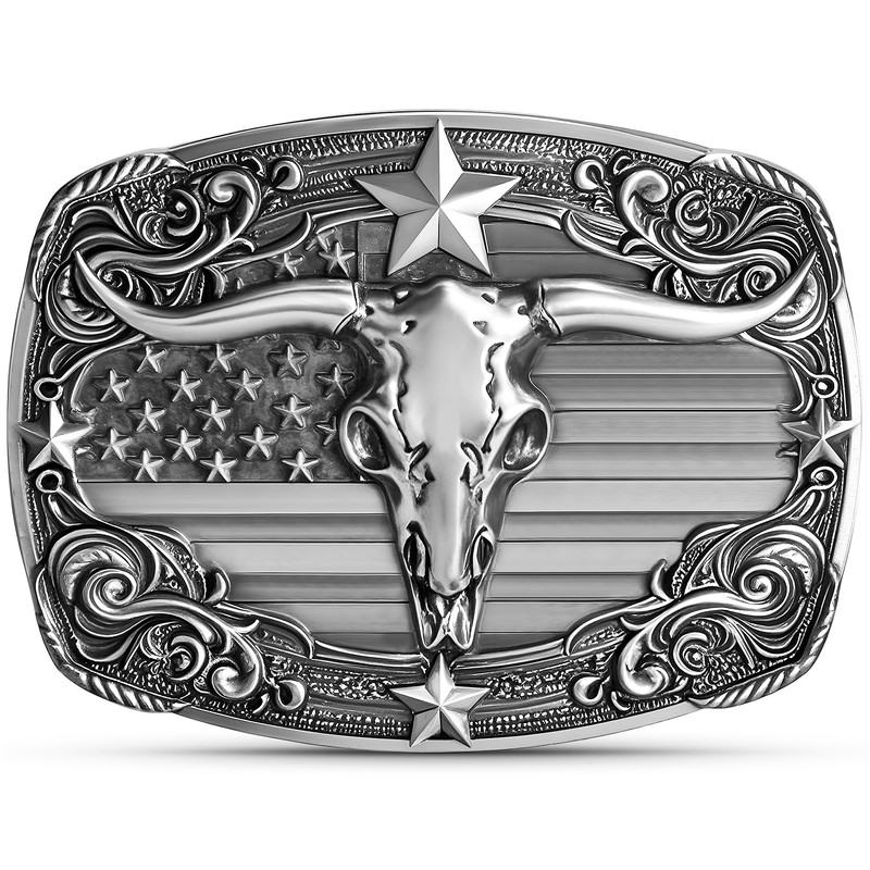 - LONGHORN BELT BUCKLE EXQUISITE AND ELEGANT DESIGN: Our western belt buckles for men women features a three-dimensional pattern combining Longhorned cow skull and the American flag. The cow head on the mens belt buckle symbolizes the freedom of nature and the power and courage of life! The American flag on the cowboy buckle reflects your patriotism, showcasing your respect, pride, and loyalty to your country!