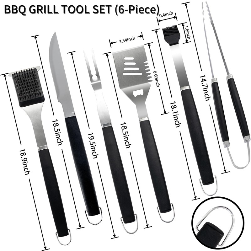 - 【Heavy Duty Materials】Say goodbye to rusty old barbecue tools with our heavy-duty grill set.Made of extremely sturdy and thick stainless steel,it can perfectly blend into any indoor or backyard barbecue party.Our Grill Brush for Outdoor Grill Quickly removes burnt on residue and quickly gets your grill clean.You can use these 6 bbq accessories to do all outdoor cooking.