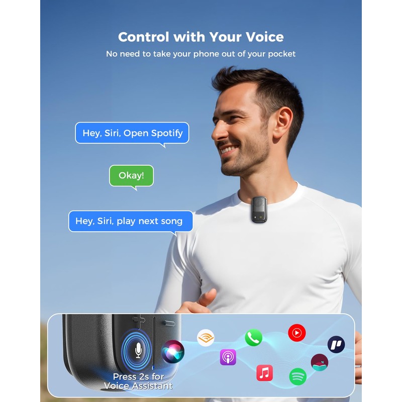 - 2025 Newest Wearable Speaker with Voice Assistant: With just a press of the voice button on your clip-on Bluetooth speaker, you can summon your favorite voice assistant (Siri/Google) to open your frequently used appslike Spotify, Apple Music, Audible, Pandora, or Amazon Musicand start playing your favorite music or audiobookswithout picking up your phone!