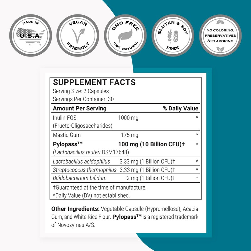 - Recommended Use - Take 2 capsules a day. Contains Inulin, Mastic gum, Pylopass (Lactobacillus reuteri DSM 17648), Lactobacillus acidophilus, Bifidobacterium bifidum, Streptococcus thermophilus | Other ingredients: white rice flour.