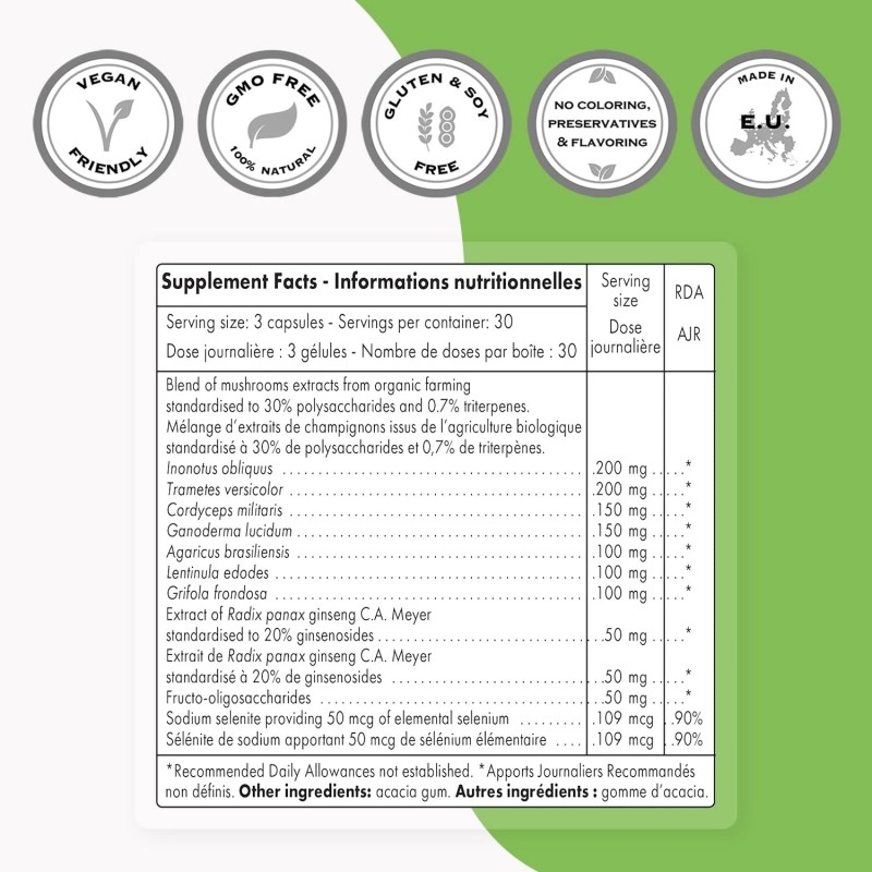 A pioneer in dietary and nutritional supplements for over 30 years. Supersmart Organic MycoComplex is an exceptional formulation containing extracts of 7 certified organic medicinal mushrooms (Inonotus obliquus, Trametes versicolor, Cordyceps militaris, Ganoderma lucidum, Agaricus brasiliensis, Lentinula edodes and Grifola frondosa), in a balanced blend designed to deliver comprehensive nutrition. This full spectrum herbal complex and technological breakthrough in nutrients offers health benefits. It can be considered as a brain supplement and an immune system booster. It also has antioxidant effects. MycoComplex is a supplement in high strength for men and women. It is encapsulated in a vegetable capsule, ensuring a maximized effectiveness for all. Our products and formulas are constantly updated to reflect the latest scientific research, advances, and production methods. We offer an outstanding quality and choice of Gluten Free, Non-GMO, Additive Free, Soy Free, Nano Particles Free and Vegan Friendly products. Supersmart offers top and pharmaceutical quality products since 1992 in form of softgels, powder, capsules, tablets, and enteric coated pills. More than 400 Supersmart products are made in GMP (Good Manufacturing Practices) & HACCP (Hazard Analysis & Critical Control Points) certified facilities. Our facilities are located in the EU and in the USA for products from all around the world. Our guiding principles have remained the same for the past 30 years, we prioritize quality, safety, efficacy, and scientific validation.