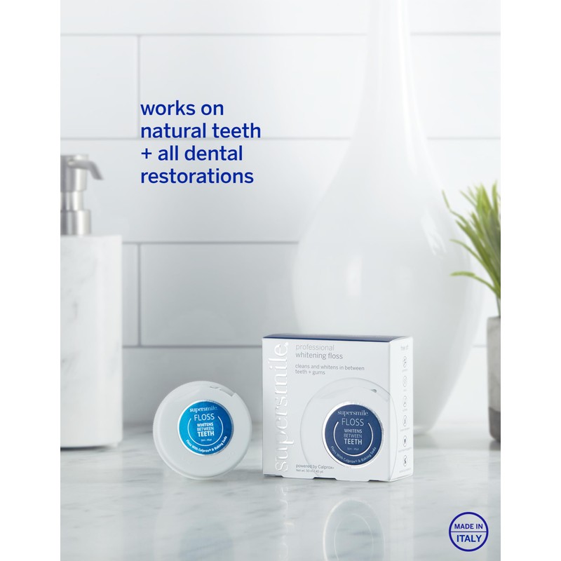 Get the brilliant smile you've always dreamed of with Supersmile's Professional Whitening Floss. Developed by Dr. Irwin Smigel, world-renowned "Father of Aesthetic Dentistry", Supersmile is the number one teeth whitening brand recommended by cosmetic dentists. The Supersmile dental floss with Calprox and baking soda removes unsightly stains between teeth, as well as plaque and bacteria from beneath the gum line, which if left untreated, can contribute to gum disease, cavities, and other oral health concerns. Supersmile products are safe and effective for use with artificial tooth surfaces, such as bonding, veneers, laminates, and dentures. Made in USA.