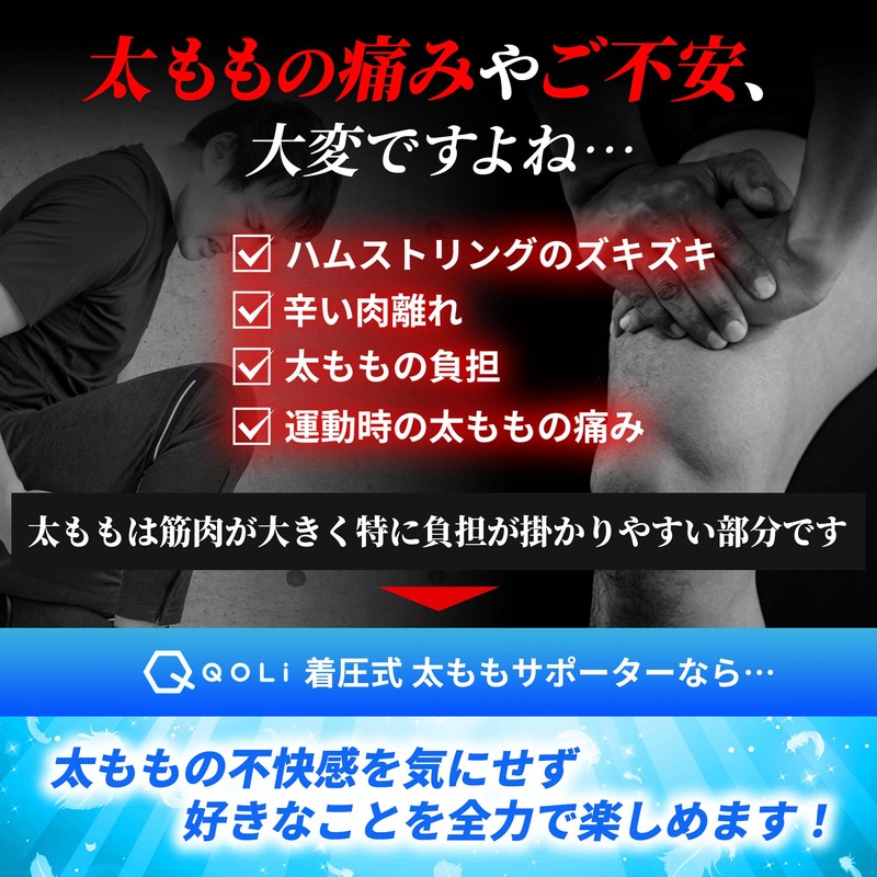 - Compression thigh supporter with built-in anti-slip edges; Improved performance: QOLi thigh supporter has been heard by athletes and developed products based on various situations. If you feel anxious about your legs as the state, we hope you can try it once and enjoy your exercise and daily life