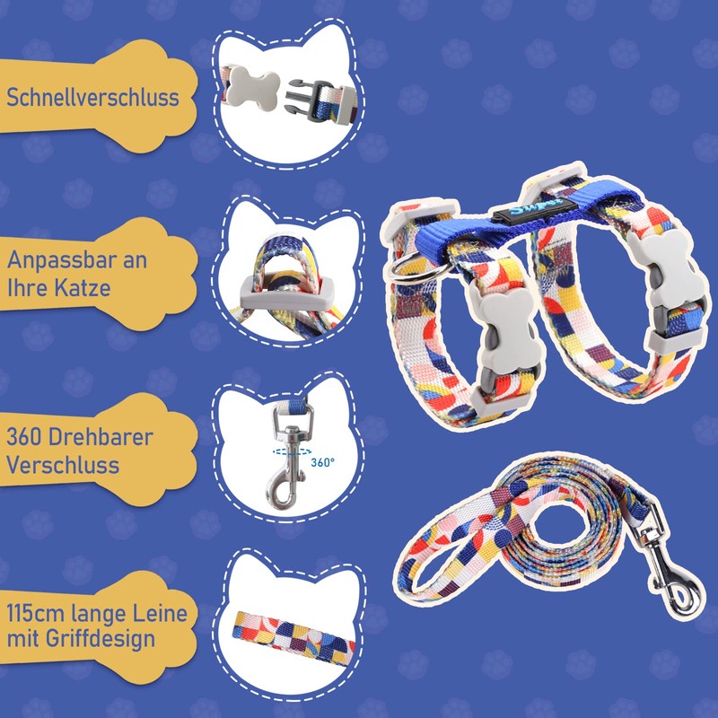 - Eye-catching look – The straps of the large harness for cats are made from a cool patchwork pattern that makes your cat stand out from other pets and is a bright addition to your everyday life. Bright colours also allow you to recognise your kitten in time so that it does not get lost when walking outdoors.