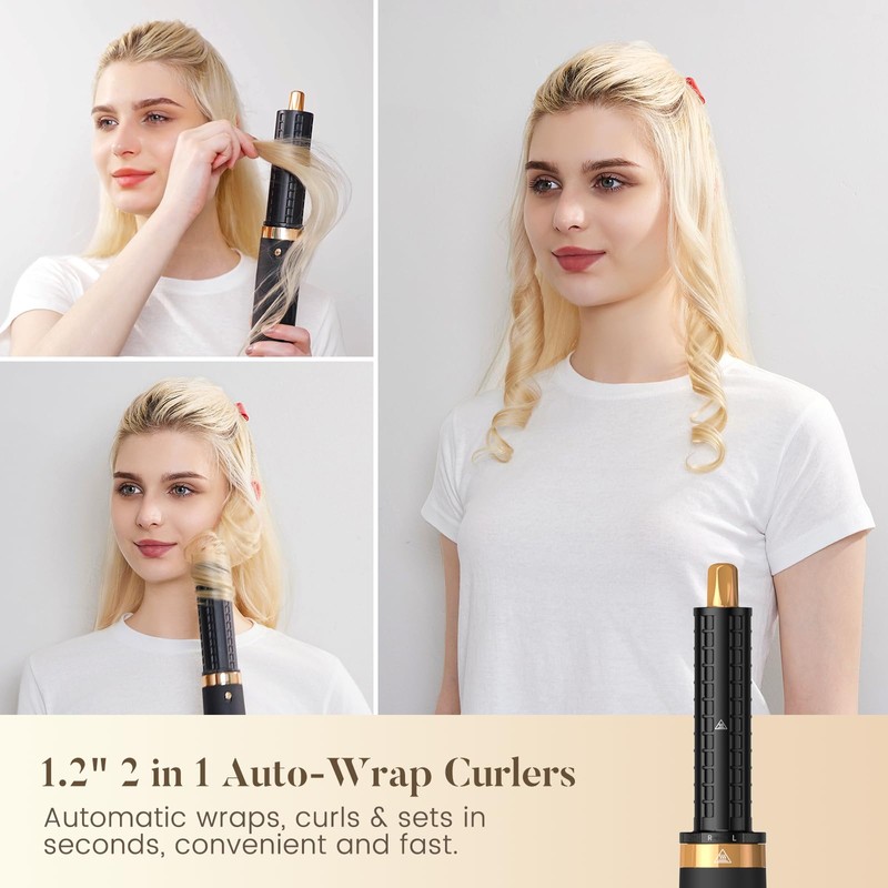 - 【1.2" 2 in 1 Auto-Wrap Curlers】 -- Automatic wraps, curls & sets in seconds, convenient and fast with Coanda Technology. A continuous flow of air forms around the curler, attracting hair to its surface.Creating voluminous curls and waves without extreme heat.