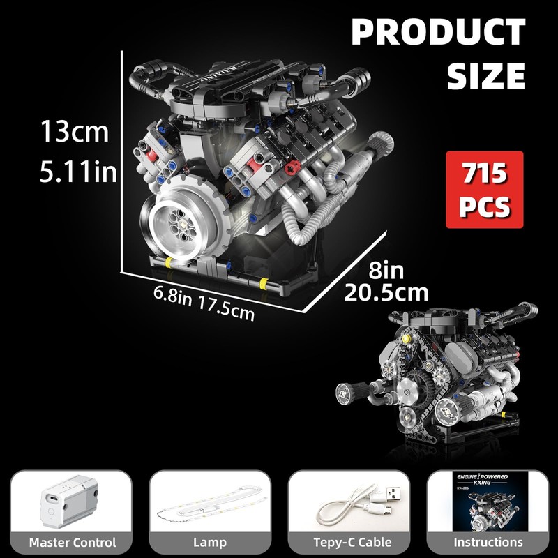 - Premium Parts & Rechargeable Power Unit: The toy engine model includes 715 smooth and high-quality building blocks, making it easy to assemble. Once completed, the model measures 6.89 x 8.07 x 5.11 inches (17.5 x 20.5 x 13 cm), with a stunning design and vibrant colors. It also comes with a rechargeable power unit, so you won’t need extra batteries to power your mini engine.