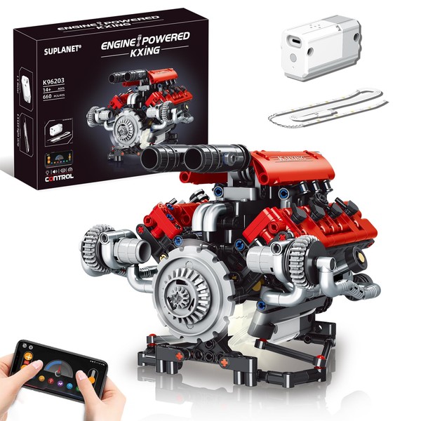 Suplanet V8 Engine Building Blocks Sets,Red Mini Engine Kit with Battery and Motor,Collectible Set for Adults, Car Engine Building Engineering STEM Projects for Kids Boys (660 Pcs)