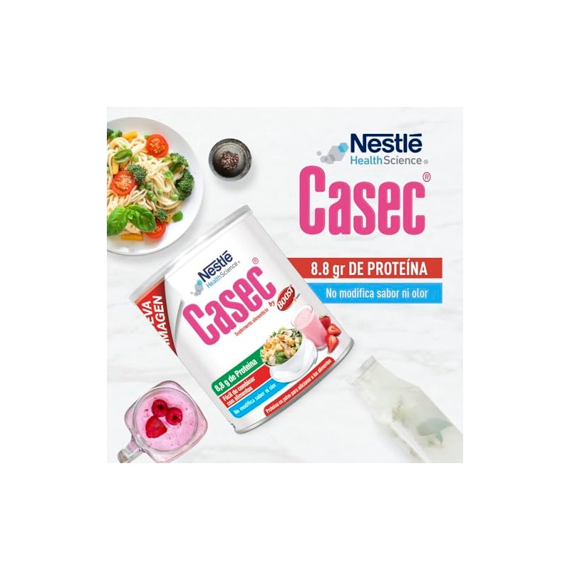 CASEC® es una proteína en polvo fácil de combinar con alimentos. Contiene 8.8g de proteínas. Caseinato de calcio. Está contraindicado para su uso por vía parenteral. Consérvese en un lugar fresco y seco. Evaluar la administración en consumidores con metabolismo proteico alterado o alergias a las proteínas de la leche de vaca. Libre de gluten. No modifica sabor, ni olor. CASEC® es un desarrollo de Nestlé Health Science. ESTE PRODUCTO NO ES UN MEDICAMENTO. EL CONSUMO DE ESTE PRODUCTO ES RESPONSABILIDAD DE QUIEN LO RECOMIENDA Y DE QUIEN LO USA.