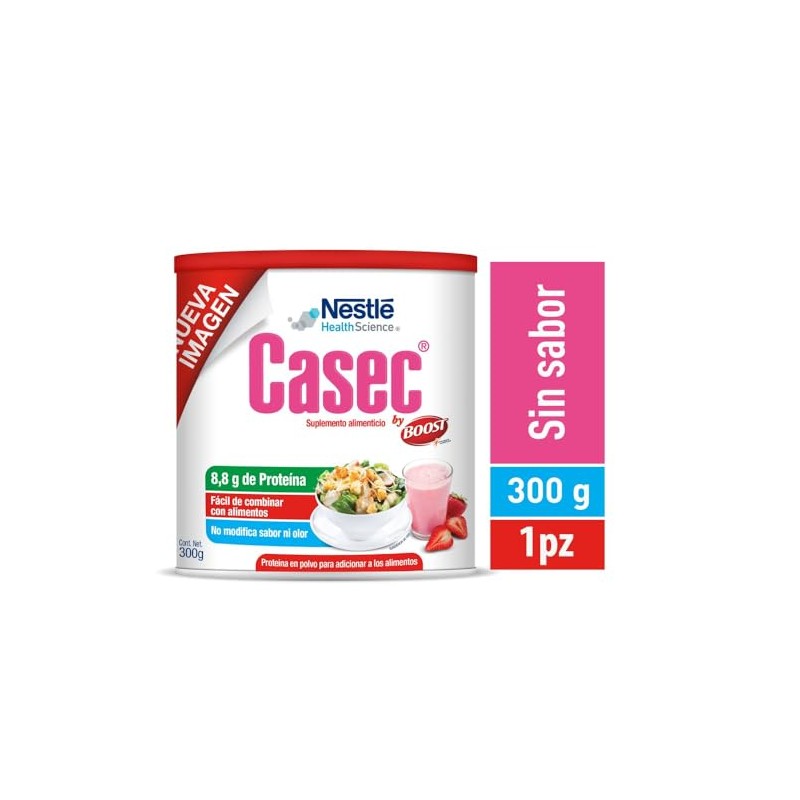 CASEC® es una proteína en polvo fácil de combinar con alimentos. Contiene 8.8g de proteínas. Caseinato de calcio. Está contraindicado para su uso por vía parenteral. Consérvese en un lugar fresco y seco. Evaluar la administración en consumidores con metabolismo proteico alterado o alergias a las proteínas de la leche de vaca. Libre de gluten. No modifica sabor, ni olor. CASEC® es un desarrollo de Nestlé Health Science. ESTE PRODUCTO NO ES UN MEDICAMENTO. EL CONSUMO DE ESTE PRODUCTO ES RESPONSABILIDAD DE QUIEN LO RECOMIENDA Y DE QUIEN LO USA.