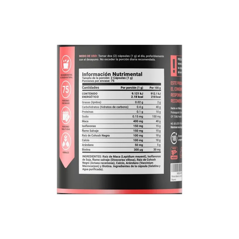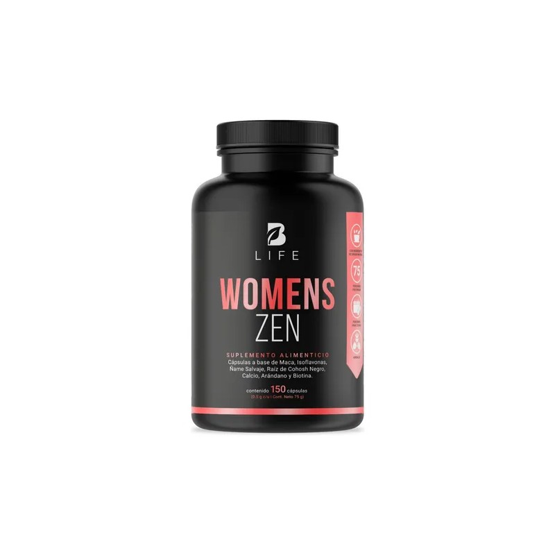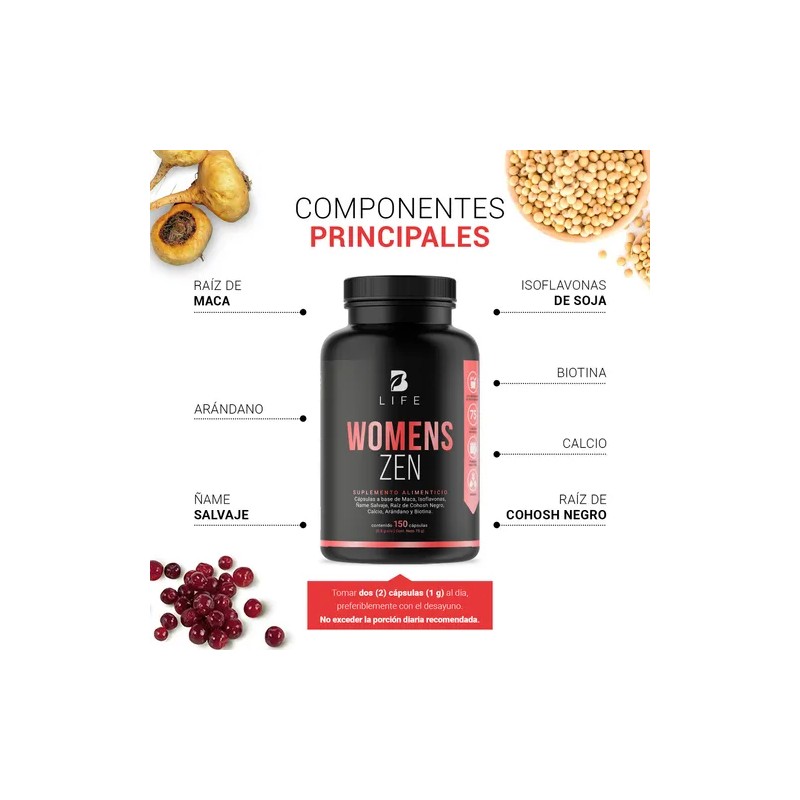 ¡Womens Zen B Life, tu equilibrio interno! Cada cápsula de 500 mg ofrece una fórmula exclusiva que combina Maca, Isoflavonas, Ñame Salvaje, Raíz de Cohosh Negro, Calcio, Arándano y Biotina, formando una sinergia de ingredientes diseñada para promover el bienestar interior de las mujeres. Esta combinación única no está presente en otras formulaciones. Contiene 150 cápsulas.