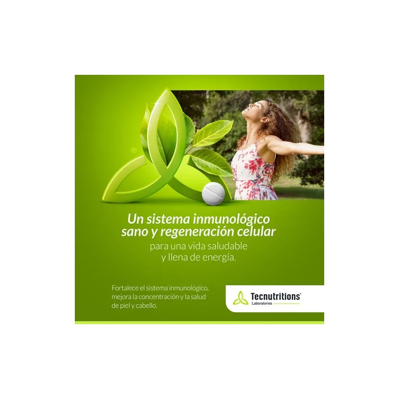 • INGREDIENTES: L-Arginina, Alga Azul AFA (Chlorophyta), Células madre de calostro de bovino, Ác. ascórbico, Arándano azul (Vaccinium mirtyllus), Espirulina (Spirulina maxima), Granada (Punica granatum), Uvas (Vitis vinifera), Flavonoides, Genciana (Gentiana lutea), Excipiente (Celulosa microcristalina, Polivinilpirrolidona K-30 y Estearato de magnesio).