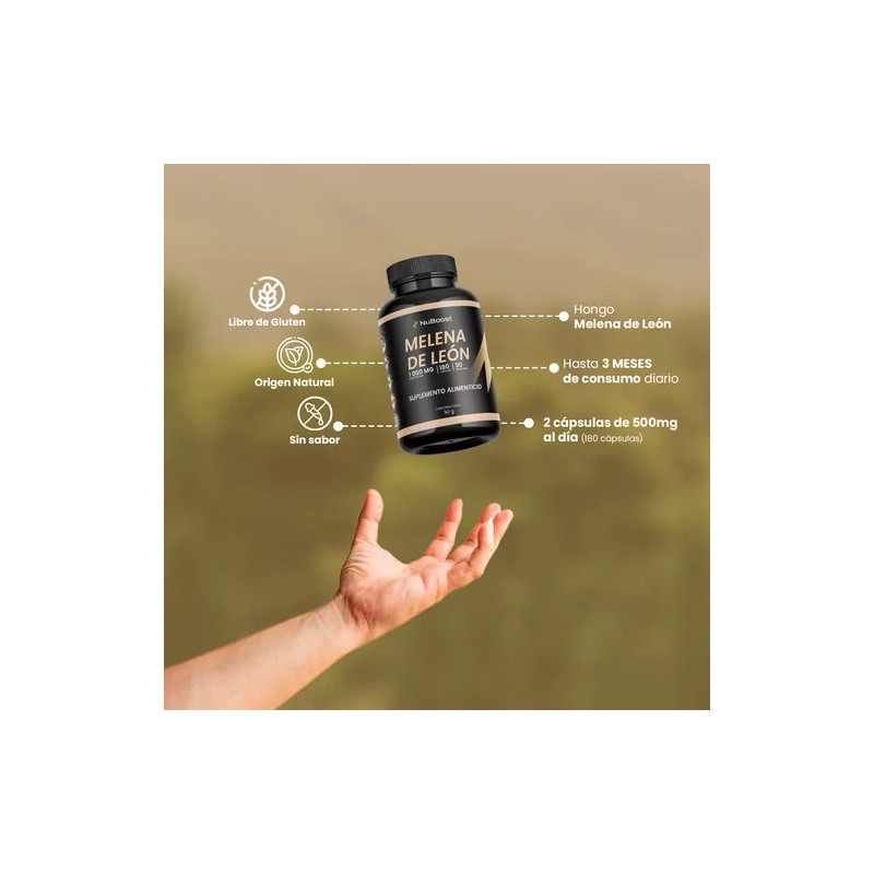 - PORCIONES Obtén 1,000 mg de Melena de León (De la especie Hericium Erinaceus). Solo necesitas tomar 1 porción de 2 cápsulas, una vez al día. Cada frasco te ofrece 180 cápsulas de suplemento Melena de León de NuBoost, esto te da hasta 90 porciones en total. COMO CONSUMIR EL SUPLEMENTO: Solo necesitas tomar 1 sola porción, de 2 cápsulas, una sola vez al día. Puede ser con o sin alimentos. SOBRE EL SUPLEMENTO MELENA DE LEÓN: Este suplemento se enfoca en impulsar el equilibrio cerebral y la función cognitiva. Con las hericenonas y erinacinas, que estiman la producción del NGF es esencial para ayudar a tu memoria, concentración y claridad mental. Además, también apoya al sistema nervioso y la salud digestiva. SOBRE NUESTROS SUPLEMENTOS Nuestro suplemento Melena de León está formulado especialmente para proporcionarte los mayores beneficios en dosis reducidas. En esta presentación, tienes que tomar solo 2 cápsulas 1 vez al día tener una suplementación completa. Todos nuestros productos tienen la fecha de caducidad impresa en la etiqueta. Generalmente son 2 años después de que el lote se fabrique. Este producto ha sido probado y aprobado por terceros, teniendo una alta pureza EL SUPLEMENTO DE MELENA DE LEÓN DE NUBOOST ESTÁ: