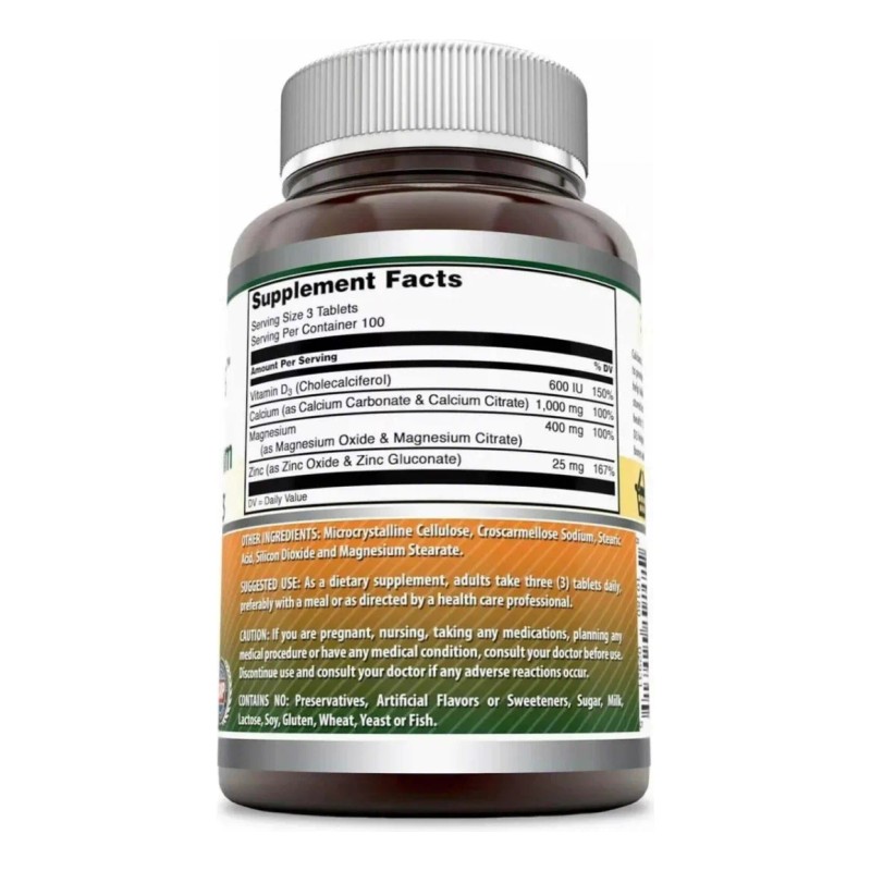 Cada porción de 3 tabletas contiene 25 mg de zinc, 1000 mg de calcio, 400 mg de magnesio y 600 UI de vitamina D3, proporcionando al menos el 100 por ciento del valor diario recomendado para estos minerales esenciales basado en una dieta de 2000 calorías.