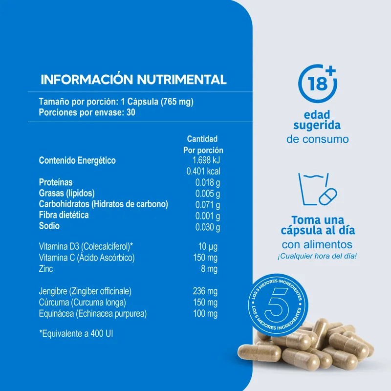 • Ingredientes principales: Vitamina C, Vitamina D3, Zinc, Equinácea, Cúrcuma, Jengibre