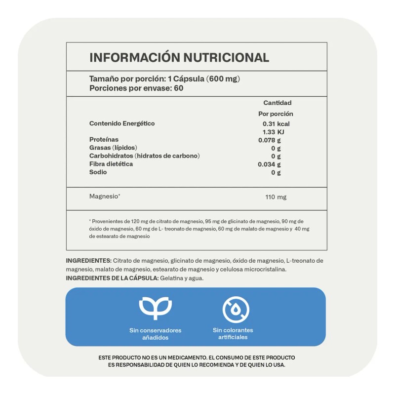 Citrato, glicinato, L-treonato, malato y estearato de magnesio trabajan de manera sinérgica para resultados óptimos