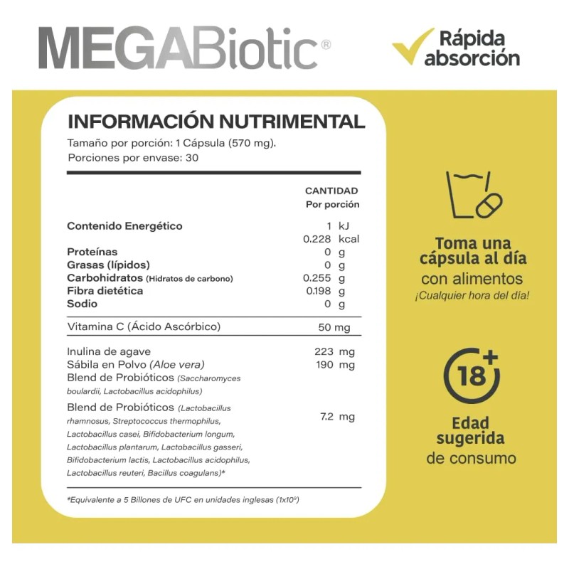 Megabiotic Probióticos 5 Billones y 11 cepas. Este envase trae 30 cápsulas, diseñadas para un mes de consumo continuo. Potenciado con Inulina de Agave y Aloe Vera y con la ventaja de no necesitar refrigeración, es ideal para la vida moderna.