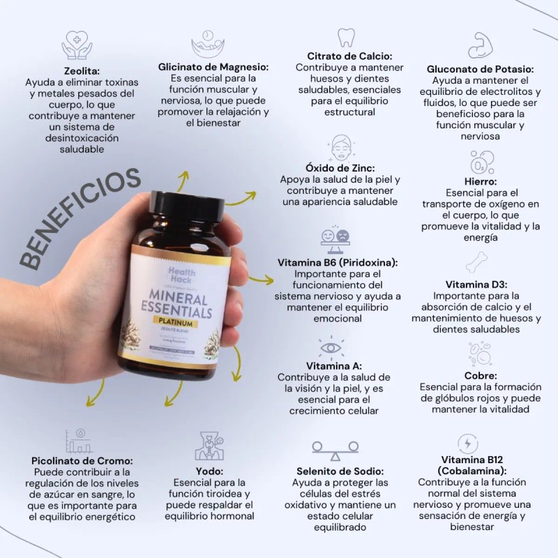 Platinum Multi Minerales con Zeolita HH es un suplemento nutricional que combina minerales esenciales con zeolita natural, un poderoso desintoxicante que ayuda a eliminar metales pesados, toxinas y radicales libres del organismo. Esta fórmula avanzada no solo fortalece huesos, músculos y sistema inmune, sino que también mejora el equilibrio mineral y promueve un funcionamiento celular óptimo.