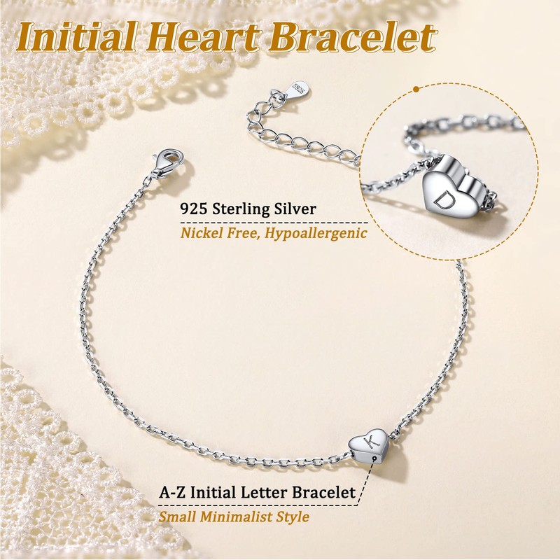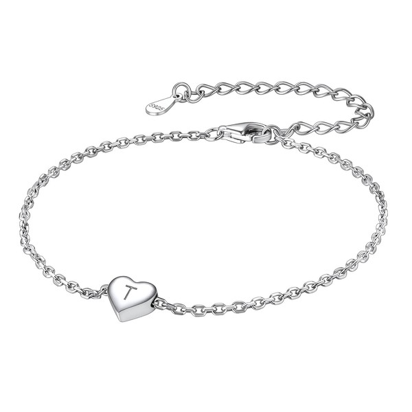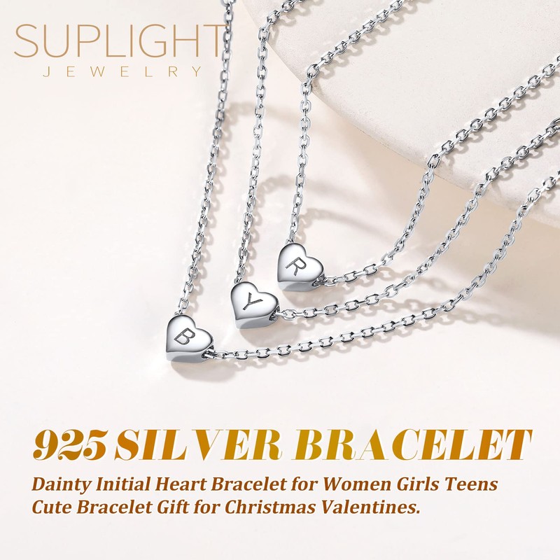 Suplight Women's Heart Bracelet with Letters A-Z 925 Silver Initial Bracelet Adjustable Chain Length 16-21 cm Gifts for Girlfriend Love Girls for Birthday Valentine's Day Christmas, Sterling Silver