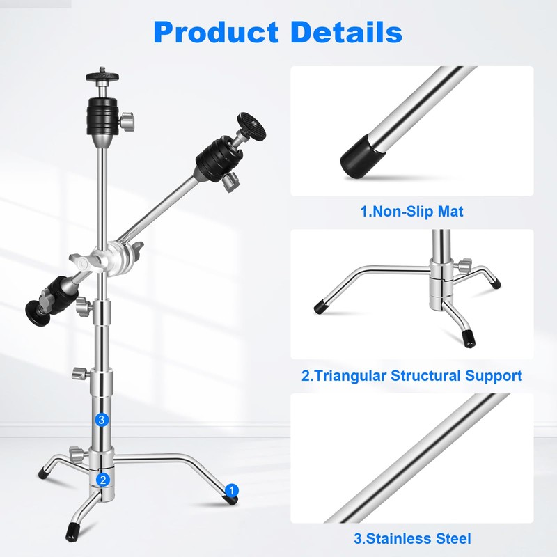 Supon 20" Mini Pocket C Stand, All-Metal Adjustable Small 20.8" C-Stand Short Tripod Stand with 13" Boom Arm Grip Head, 3 Ball Head, Sliding Leg for camera, smartphone, light, mic photography - Silver