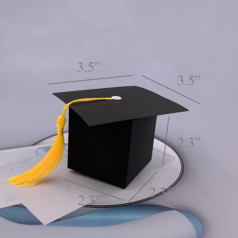 - Size: graduation cap boxes measure 2.3" x 2.3" x 2.3",can fill with 6-8 pcs Ferrero,20-25 pcs kisses,candies,chocolates and other graduation keepsake such as keychain