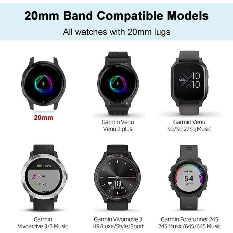 - Compatible models: This 20 mm nylon strap is compatible with Garmin Venu Sq 2/Venu Sq 2 Music/Venu 2 Plus/Move Sport/Venu Sq/Venu/Vivoactive 3/Vivoactive 3 Music/Vivoactive HR/Vivomove 3/Vivomove Luxe/Vivomove Style/Forerunner 245/245 Music. Forerunner 645/645 Music