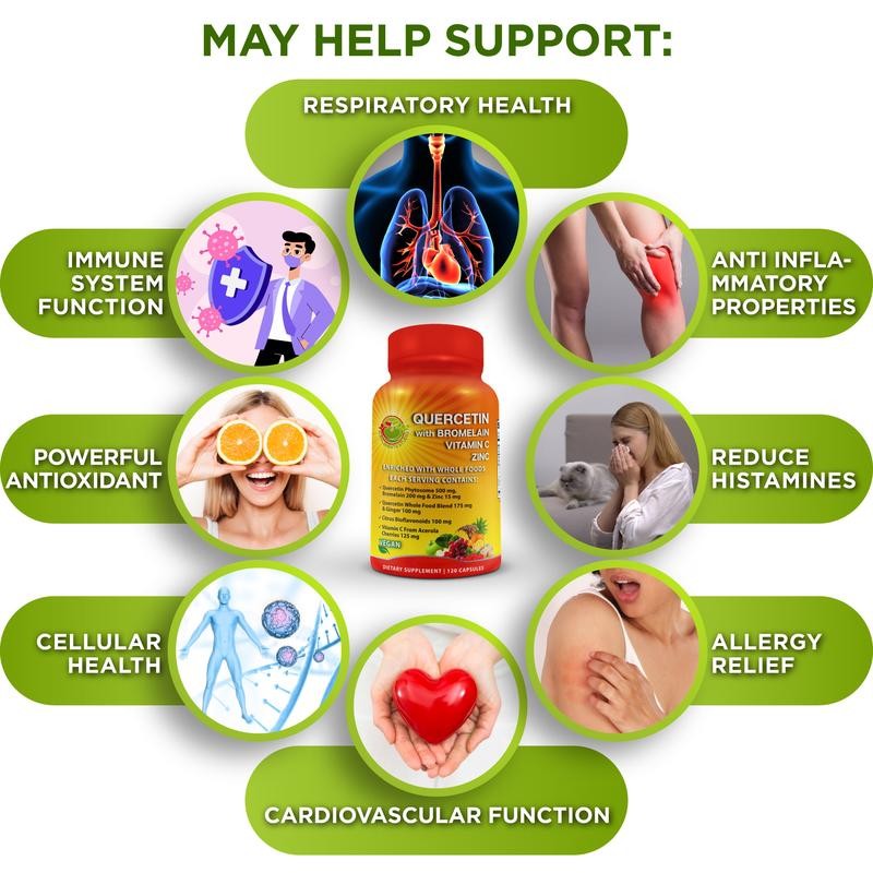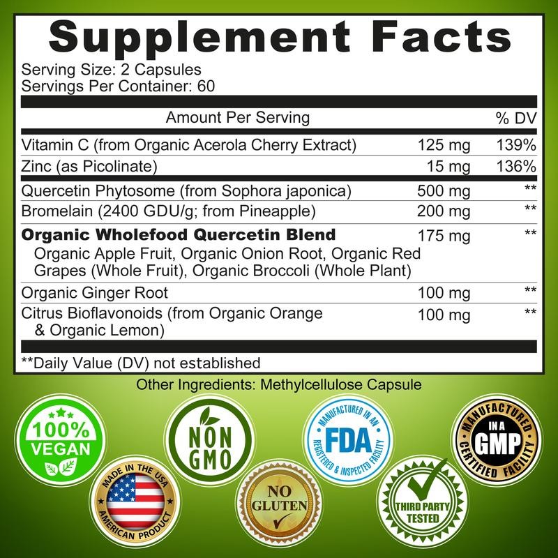 - Exceptional Value Formula: 500mg quercetin phytosome, 175mg organic quercetin whole food blend, 15mg zinc picolinate, 200mg bromelain, 100mg ginger root, 125mg vitamin C, and 100mg citrus bioflavonoids.