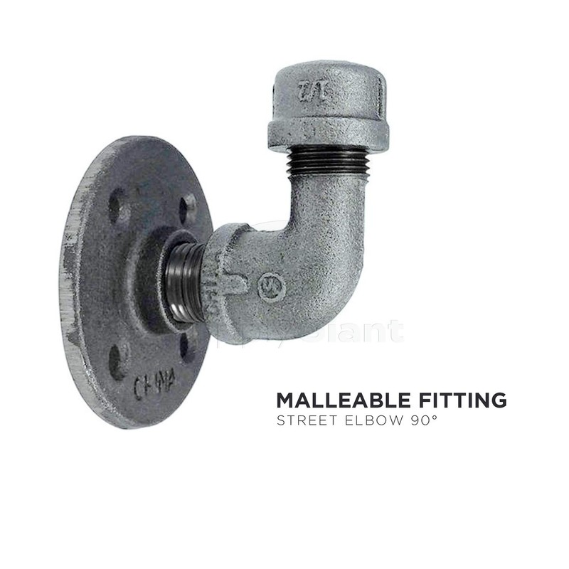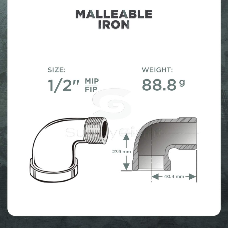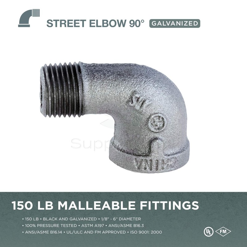 This is an Supply Giant Street elbow, from their pipe fittings line, with 90 Degree bend and with 1/2 inch female to male threaded ends. The Part is made of Malleable iron, with a galvanized finish, and is designed for applications where the pressure does not exceed 150 lb. The Part is produced in an ISO 9001:2000 qualified production environment and it has been pressure tested in the factory. The fitting complies to the ansi/asme B16.3 and B16.14 and to the ASTM a-197 standards. It is approved by UL/ULC and FM.