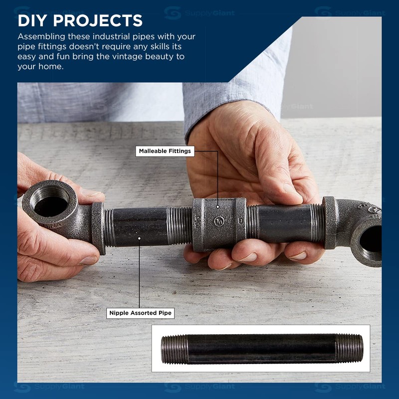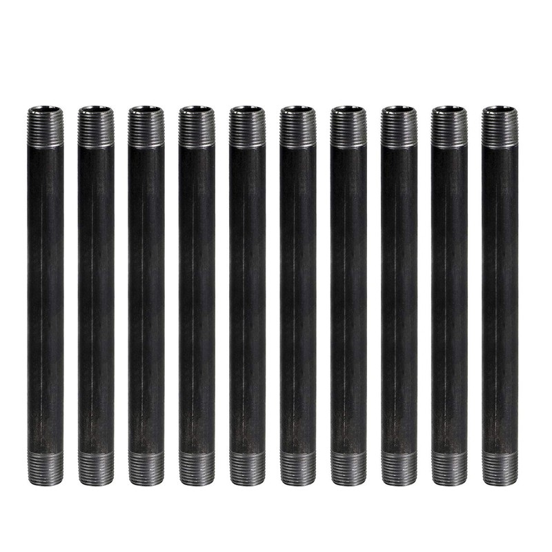 Supply Giant OQCM1212-10 Steel Nipple Pipe, Build Vintage DIY Furniture With Pre Cut Industrial Iron Pipe, Threaded Malleable Pipe 1/2 In x 10 In Black (Pack Of 10)