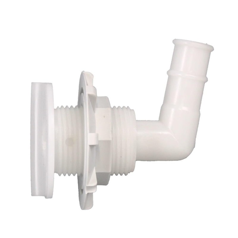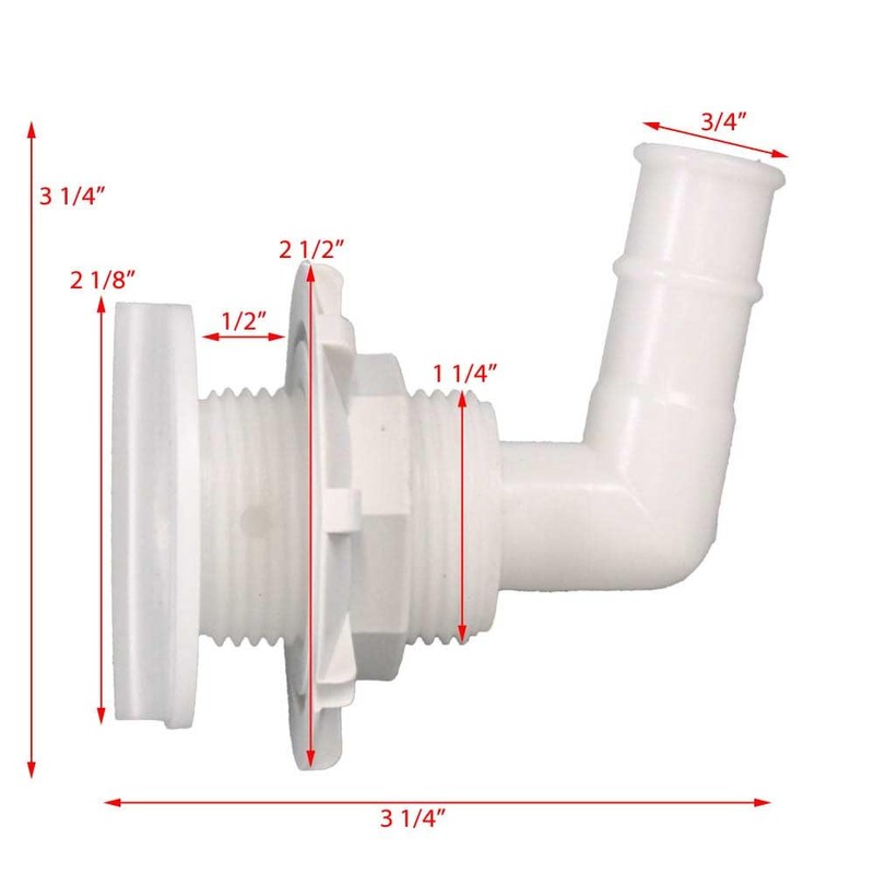 Constructed from white marine grade plastic, this elbow thru hull measures approximately 3 1/4" H x 3 1/4" L overall. Requires an approximate 1 1/4" cutout. The flange measures approximately 2 1/8" Dia, and the included nut measure approximately 2 1/2" Dia overall. Features (1) 3/4" Dia. barbed hose connection. Hosts a max panel thickness of approximately 1/2" thick.