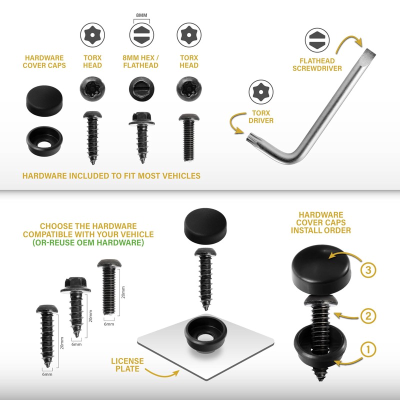 - ✔️ 《 INCLUDED IN PACKAGE 》 One New black powder-coated license frames with three sets of screws (12 Pieces Total) Stainless Steel Black Zinc Plated (Rust Proof) screws. All are 20mm tall and 6mm wide but with different treads that will fit on most vehicles with wrench "L" tools that has a flat head on one side and Security Torx T30 on the other side. x4 Black screw cover caps are included, making this a quick and easy DIY installation with essential tools.