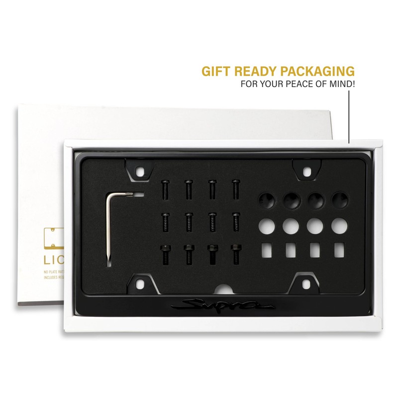 Supra License Plate Frame – Stealth Black Powder Coat UV Resistant Rust-Proof Steel Plate Holder - One Piece - Compatible with 1993-2025 Supra Turbo GR (3D Raised Letter & MOUNTING Hardware)