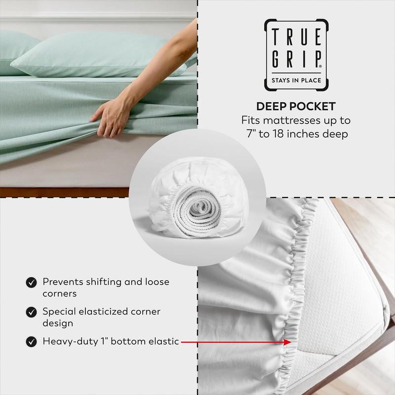 - Perfect Fit for Your Mattress: Our fitted sheet features a patented True Grip fit technology, which consists of a 1-inch wide boxer elastic on the edges along with ½-inch elastic on the drop, providing a snug fit assembly with varying depths of mattresses. It also features a "Smart Head/Foot Tag" for easy identification of sides.