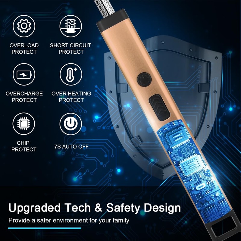 - Diseño seguro y fácil de usar: el encendedor de velas con interruptor a prueba de niños en el botón de encendido/apagado protege a los niños de encenderse accidentalmente, más allá de 7 segundos, la chispa se detendrá automáticamente, 7 segundos se apagará automáticamente evita daños demasiado altas. La visualización LED de la batería te da la punta del volumen de la batería en tiempo real por 4 luces LED.